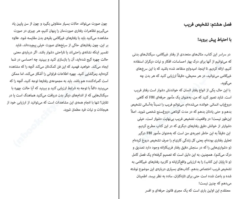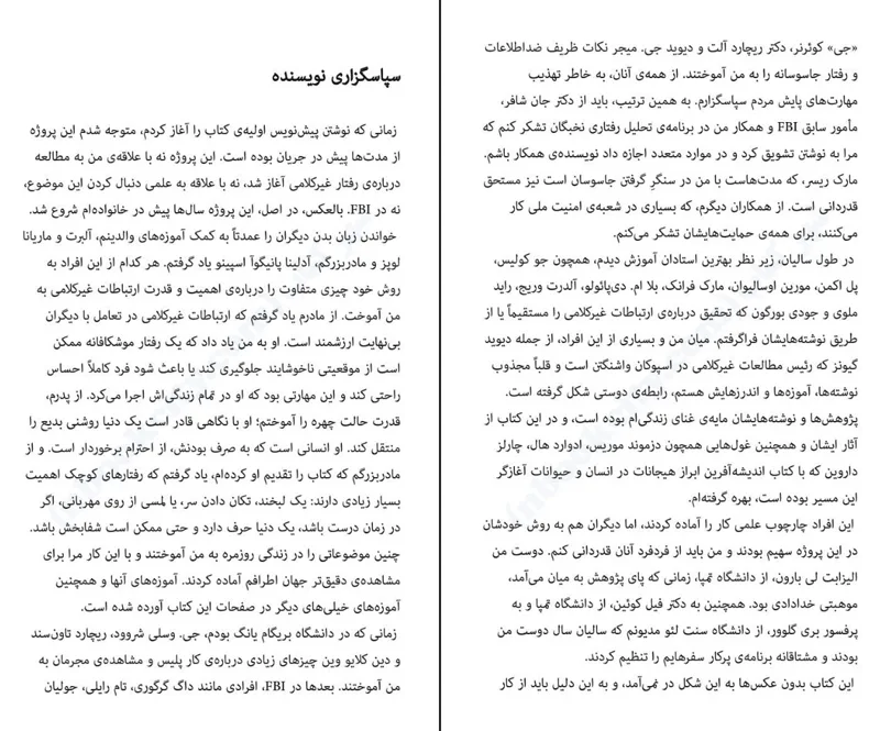 این کتاب پر از مثال هایی است از تجارب حرف های ناوارو و به ما راه های جدیدی را یاد میدهد تا جهان را کشف کنیم تصاویر کتاب کمک می کنند تا درک بهتری از رفتارها داشته باشید برخلاف بسیاری از کتاب های دیگر که درباره ی رفتار غیر کلامی نوشته شده اند اطلاعاتی که در اینجا ارائه میشود به جای اظهار نظر شخصی و گمانه پردازی های نظری مبتنی بر حقایق علمی و یافته های تجربی است. جو ناوارو با تقسیم بندی کتاب به ۹ بخش قسمت های مختلف بدن را از نظر رفتار غیرکلامی مورد بررسی دقیق و موشکافانه قرار می دهد تا با مشاهده و تحلیل دقیق بتوانید آنچه را که مردم به صورت ناخودآگاه منتقل می کنند دریابید.