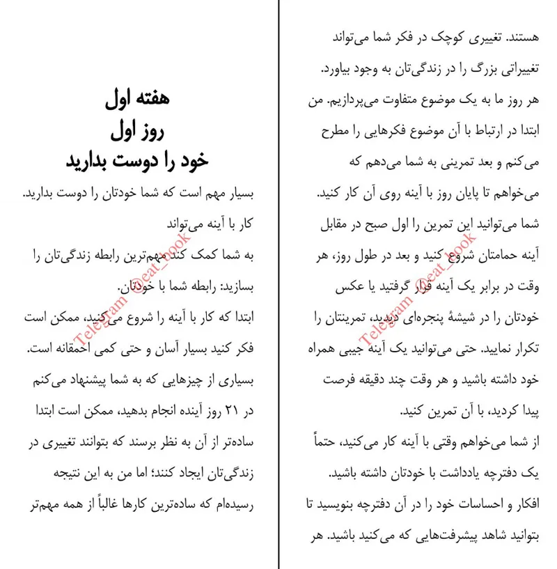 بسیار مهم است که شما خودتان را دوست بدارید کار با آینه می تواند به شما کمک ترین رابطه زندگیتان را بسازید رابطه شما با ابتدا که کار با آینه را شروع ممکن است فکر کنید بسیار آسان و حتی کمی بسیاری از چیزهایی که به شما پیشنهاد می کنم در ۲۱ روز آینده انجام بدهید ممکن است ابتدا ساده تر از آن به نظر برسند که بتوانند تغییری در زندگیتان ایجاد کنند؛ اما من به این نتیجه رسیده ام که ساده ترین کارها غالباً از همه مهم تر هستند. تغییری کوچک در فکر شما می تواند تغییراتی بزرگ را در زندگیتان به وجود بیاورد. هر روز ما به یک موضوع متفاوت می پردازیم من ابتدا در ارتباط با آن موضوع فکرهایی را مطرح می کنم و بعد تمرینی به شما می دهم.