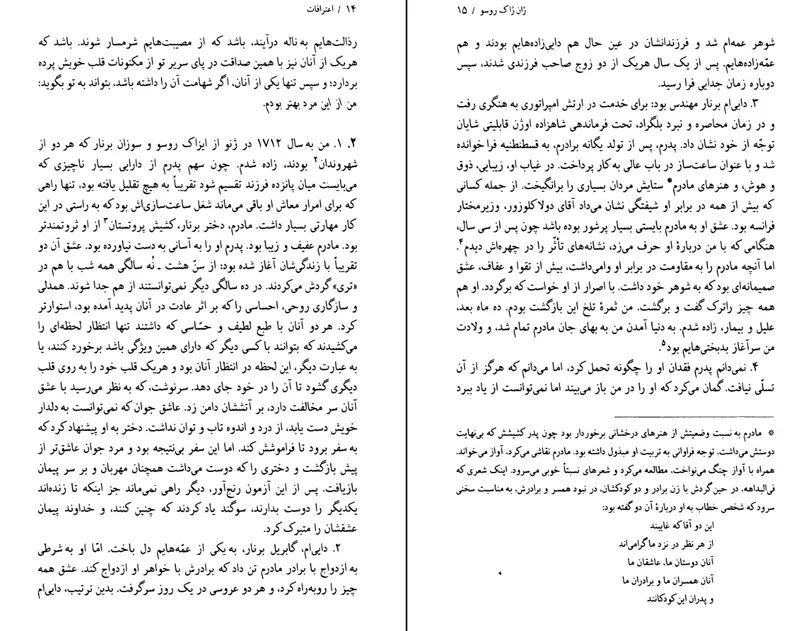 این یگانه تصویری است که از انسان وجود دارد و به احتمال تا ابد همین یک تصویر وجود خواهد داشت. تصویری که دقیقاً از روی طبیعت کشیده شده و چهره راستین او را ترسیم کرده است. هر که هستید ای کسانی که تقدیر یا اعتماد من شما را حاکم بر سرنوشت این دفتر کرده است به خاطر شوربختی هایم به خاطر احساسات و عواطفتان و به نام نوع بشر از شما تمنا دارم که این اثر یگانه و سودمند را از میان نبرید. اثری که می تواند در مطالعهٔ احوال بشر، مطالعه ای که بی گمان هنوز آغاز نشده است به عنوان نخستین معیار مقایسه به کار رود و نیز تمنا دارم تنها یادگار با ارزشی را که حرمت بخش خاطره من است و نمودار اخلاق و منش من و به دست دشمنانم تحریف نشده است، از بین نبرید و سرانجام، حتی اگر شما خود یکی از این دشمنان سرسخت باشید.