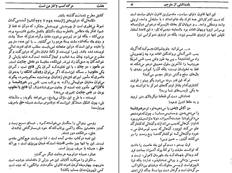 از آن پس در سراسر جهان تنها و تنها از هیروشیما سخن رفت و از تجلی دوزخ برخاك در ششم اوت ۱۹٤۵؛ و در باب آن کشتار ابلیسی دیگر چنان سکوت شد که امروز پس از نزديك به سی سال، شاید بسیاری از شما که این سطور را می خوانید هرگز نشنیده باشید که درست سه روز بعد از آن در سپیده دم روز نهم اوت همان سال به فرمان آقای ترومن يك بار دیگر نیز دریچه ای از دوزخ بر زمینیان گشوده شده است: در بندر ناگازاکی چراكه حتى دائرة المعارف لاروس نیز که از تعداد موی دم الاغ ملا نصر الدین خبر می دهد در این باره به جز همین مختصر که بمبی هم بر ناگازاکی افتاده اشاره ای نمی کند! آخر فاتح که شدید دیگر کسی از شما حساب نمی کشد.