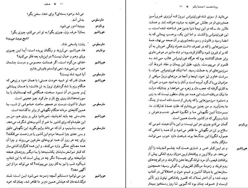 برای فراهم آوردن متن حاضر من یک بار ترجمه ای را که اینو بونفوا از هملت به زبان فرانسه پرداخته است به فارسی درآوردم. سپس همان را راهنمای خود کرده، از روی متن انگلیسی نمایشنامه که ضمن کلیات آثار شکسپیر چاپ دانشگاه آکسفورد آمده است ترجمه دیگری هرچه دقیق تر و کامل تر ترتیب دادم. متن دومی که بدین سان به دست آمده گرچه تا سرحد امکان دقیق و درست بود اما هنوز کلام آن نیاز به آرایش و پیرایش کلی داشت. از این رو برای سومین بار در تنقیح متن کوشیدم و آن را کم و بیش به صورتی که درخور عرضه داشت به پیشگاه مردم نکته سنج باشد درآوردم.