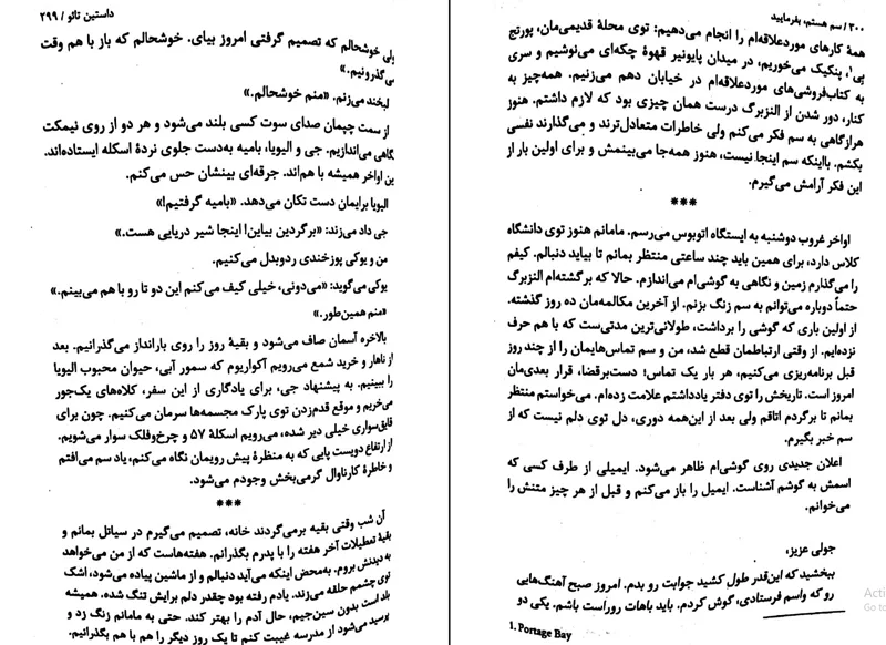 چند بار دیگر هم به پیام صوتی گوش می دهم و بعد همه چیز را پاک می کنم. آن وقت از تخت پایین می آیم و به دنبال هرچیزی که متعلق به سم بوده یا من را یاد او می اندازد کشوها را زیرورو می کنم عکس هایمان کارت تبریک تولد بلیت سینما شکوفه های اوریگامی و کادوهای احمقانه ای مثل مارمولک عروسکی که پاییز گذشته سم توی کارناوال برنده شد، به علاوه تک تک سی دی های گلچینی که توی این سال ها برایم رایت کرده. اصلاً مگر کسی دیگر سی دی رایت می کند؟ همۀ این ها را توی جعبه ای می چپانم هر روز که می گذرد نگاه کردن به این یادگاری های خرده ریز سخت تر می شود. می گویند فراموشی به مرور زمان راحت تر می شود؛ ولی حتی نمی توانم عکسی را بدون لرزش دست هایم بردارم.