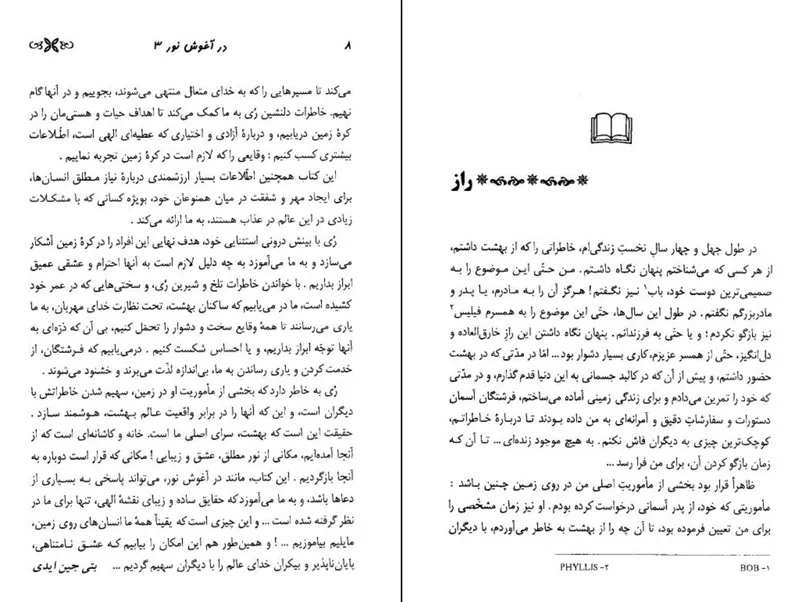 محصول کتاب در آغوش نور ۳ از ری میلز در سایت فایل خونه برای دانلود آماده شده است. در طول چهل و چهار سال نخست زندگی ام خاطراتی را که از بهشت داشتم از هر کسی که می شناختم پنهان نگاه داشتم من حتی این موضوع را به صمیمی ترین دوست خود باب نیز نگفتم هرگز آن را به مادرم یا پدر و مادربزرگم نگفتم در طول این سال ها حتی این موضوع را به همسرم فيليس نیز بازگو نکردم و یا حتی به فرزندانم پنهان نگاه داشتن این راز خارق العاده و دل انگیز حتی از همسر عزیزم کاری بسیار دشوار بود. اما در مدتی که در بهشت حضور داشتم و پیش از آن که در کالبد جسمانی به این دنیا قدم گذارم.