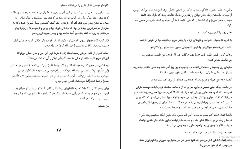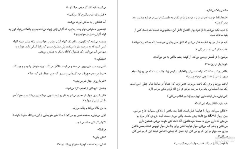 دستی با ملایمت و به سرعت دور سرم را لمس می کند. هنوز زنده ام. واقعا عجیب است. تموم شد. چشمات رو باز کن حالا به من نگاه کن بهم نگاه کن میتونی اسمت رو بهم بگی؟ می خواهم حرف بزنم دهانم را باز کنم ولی صدایم به طرز مسخره ای خفه است. گمانم زبانم را گاز گرفته ام. دهانم پر از خون گرم است و مزه آهن می دهد. نمی توانم تکان بخورم. می خوایم بگذاریمت روی اسپاین بورد باشه؟ یه لحظه ممکنه احساس ناراحتی کنی، ولی بهت مورفین می زنم تا دردت کم بشه صدای مرد آرام و یکنواخت است انگار خیلی عادی است که دراز به دراز، خرد و خمیر روی بتون خیره رو به آسمان تاریک ولو باشی می خواهم بخندم می خواهم بگویم که اینجا بودنم چه قدر مسخره است ولی گویا هیچ کدام از اعضای بدنم آن طور که باید کار نمی کند. صورت مرد از جلوی چشمم دور می شود زنی با کت شبرنگ که موهای تیره فرفری اش را دم اسبی بسته رویم خم می شود و ناگهان چراغ قوه ای به چشمم می اندازد.