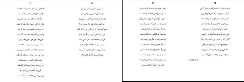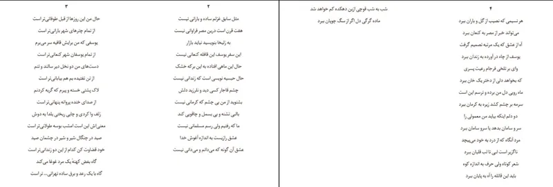 مثل سابق غزلم ساده و بارانی نیست هفت قرن است درین مصر فراوانی نیست به زلیخا بنویسید نیاید بازار این سفر یوسف این قافله کنعانی نیست حال این ماهی افتاده به این برکه خشک حال حبسیه نویسی است که زندانی نیست چشم قاجار کسی دید و نلرزید دلش بشنوید از من بی چشم که کرمانی نیست بالبی تشنه و بی بسمل و چاقویی کند ما که رفتیم ولی رسم مسلمانی نیست عشق رازیست به اندازه آغوش خدا عشق آن گونه که می دانم و میدانی نیست.