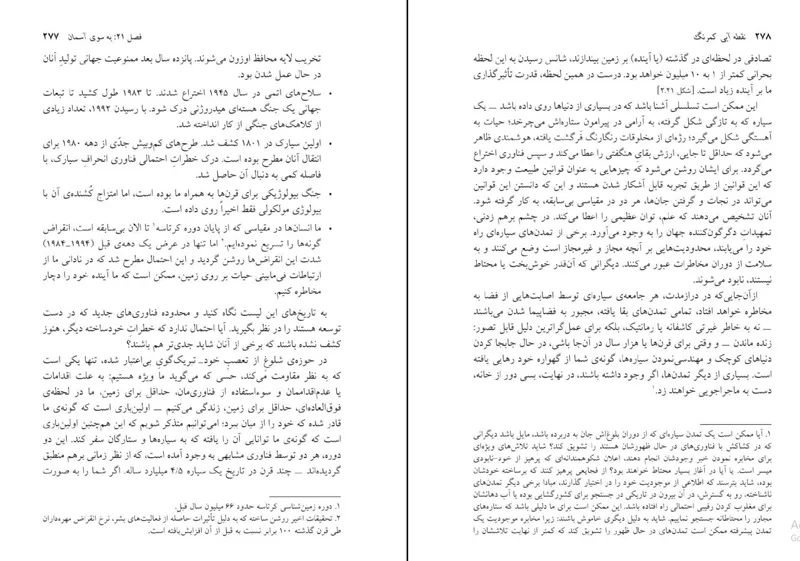 محصول کتاب نقطه ی آبی کمرنگ از کارل سیگن در سایت فایل خونه برای دانلود آماده شده است. از همان آغاز سرگردان بودیم جایگاه هر درختی را تا فاصله یک صد مایل می دانستیم. وقتی میوه ها و دانه ها می رسیدند ما آن جا بودیم ما گله ها را در مهاجرت سالانه شان دنبال می کردیم خوردن گوشت تازه ما را به وجد در می آورد. ما با خدعه کمین مخفی شدن و حمله نیرومندانه، ضمن همکاری گروهی بیش از آنچه به تنهایی قادر به شکار بودیم را به دست می آوردیم ما به یکدیگر متکی بودیم. به تنهایی از عهده همه چیز برآمدن به اندازه تصور استقرار در یک محل مضحک بود ما با همکاری هم فرزندانمان را از شیرها و کفتارها محافظت می کردیم، به آن ها مهارت های مورد نیاز و ساخت ابزار را آموزش می دادیم در آن هنگام، همچون اکنون، فناوری کلید بقای ما بود وقتی خشک سالی به درازا می انجامید یا زمانی که سرمایی ناراحت کننده در هوای تابستان درنگ میکرد گروه ما برخی اوقات به سرزمین های ناشناخته نقل مکان می کرد.