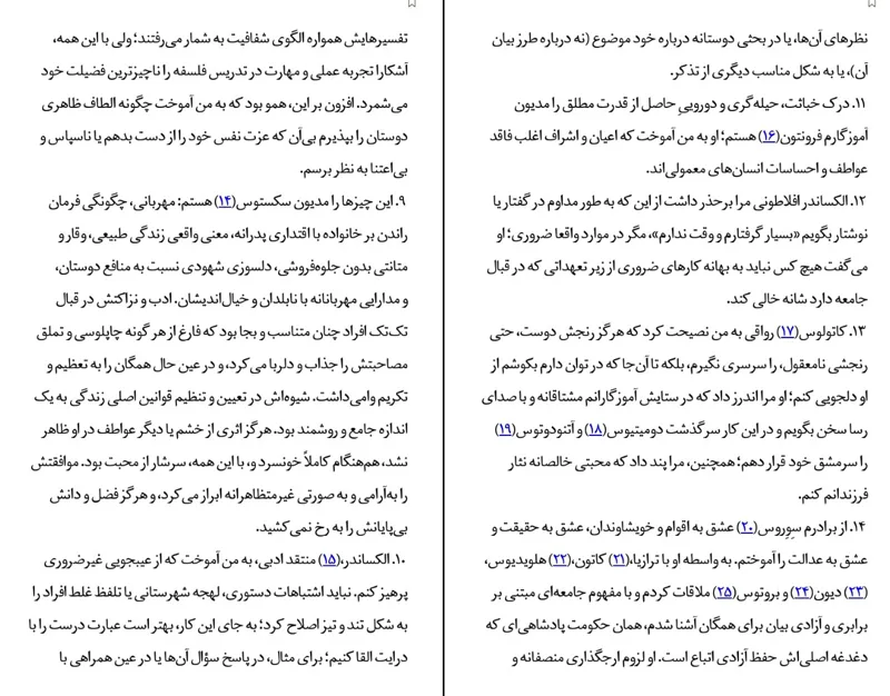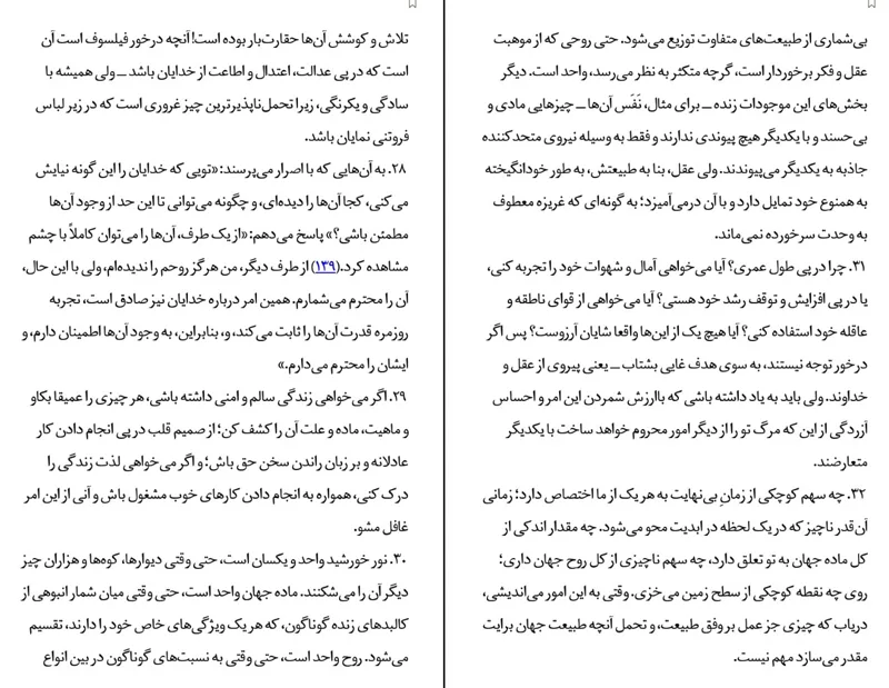 آموزگارم مرا از طرفداری از سبز یا آبی در مسابقات ارابه رانی یا سبک یا سنگین در مبارزات گلادیاتوری برحذر داشت و ترغیبم کرد که تن به کار دهم، قناعت پیشه کنم به کار خود بپردازم و به شایعات گوش ندهم. به لطف دیوگنتوس آموختم که به کارهای پیش پا افتاده نپردازم به جادوگران و رمالان، سحر جادو، جن گیری و تمامی چنین اموری به دیده تردید بنگرم از خروس بازی و سرگرمی هایی از این قبیل دوری گزینم از صراحت لهجه آزرده نشوم خودم را با فلسفه آشنا کنم.