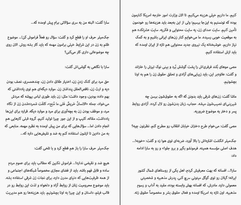 نمای بعدی فیلم بیرون از اتاق و در فضایی تاریک بود؛ زیر درختی بلند و پیر دختر دیگر حرکتی نمی کرد با چراغ گوشی دهانه چاه را پیدا کردند؛ صفحه گرد فلزی که روی چاه بود را کنار زدند؛ دختر را بلند کردند و انداختند داخل چاه مرد ریشو سر و دست هایش را رو به آسمان کرد و گفت: خدایا! این خدمت رو از ما قبول کن خدایا! ریشه فساد رو از این مملکت بگن. فیلم تمام شد چراغ های اتاق جلسه روشن شد ده نفری که در سالن دور میز نشسته بودند چشم هایشان را از مانیتور برداشتند و کف زدند. سارا موهای بلند قهوه ای اش را از روی صورتش کنار زد.