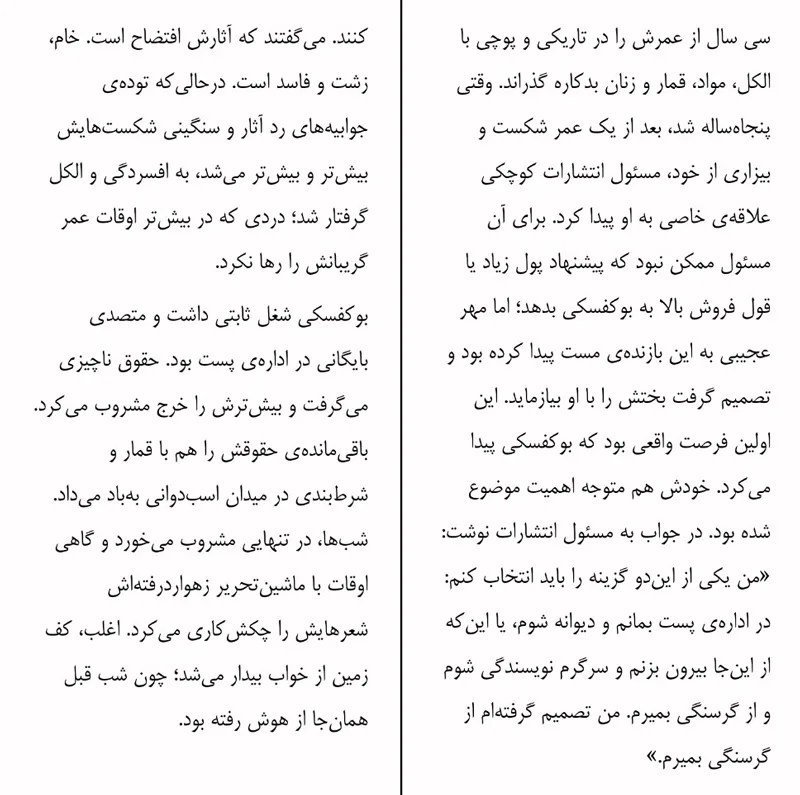 بوکفسکی شغل ثابتی داشت و متصدی بایگانی در اداره ی پست بود. حقوق ناچیزی می گرفت و بیشترش را خرج مشروب می کرد. باقی مانده ی حقوقش را هم با قمار و شرط بندی در میدان اسب دوانی به باد می داد. شب ها در تنهایی مشروب می خورد و گاهی اوقات با ماشین تحریر زهوار درفته اش شعرهایش را چکش کاری می کرد. اغلب کف زمین از خواب بیدار میشد؛ چون شب قبل همان جا از هوش رفته بود.