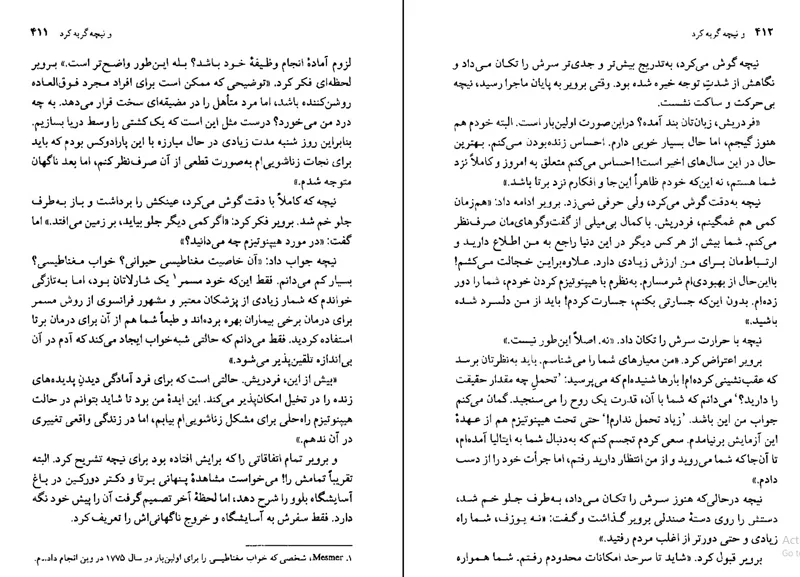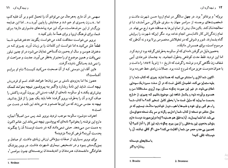 برویر در جواب پیش خدمت سرش را به علامت تایید تکان داد. او پسر نوجوانی بود سیزده چهارده ساله با موهایی خیس که به عقب شانه کرده بود. راستی چه مدتی، فرورفته در خود آنجا نشسته بود به خیال بافی؟ برای چندمین بار به ساعت جیبی اش نگاه کرد باز هم ده دقیقه از زندگی هدر رفت و تازه برای چه؟ مثل همیشه فکرش نزد برتا ،بود، برتای دوست داشتنی که دو سال تمام معالجه اش می کرد به یاد کلمات طعنه آمیز او افتاد: دکتر برویر چرا از من وحشت دارید؟ و آن جمله اش را به خاطر آورد که پس از این که دکتر اعلام کرد دیگر نمی تواند به مداوای او ادامه دهد، به برویر گفت: من منتظر خواهم ماند. شما تنها مرد زندگی من خواهید بود. به خود نهیب زد کافی است! بس کن دست از فکر و خیال بردار! پس چشمانت به چه دردی می خورند.
