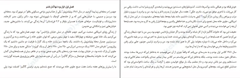 جهنم را در محله ای زیبا پیدا کردیم در سال ۱۹۸۱ ویلیامزویل یکی از جذاب ترین نواحی مسکونی بافلو در نیویورک بود. محله ای بود سرسبز و صمیمی با خیابان هایی امن که پر از خانه های کوچک با شهروندانی نمونه بود دکتر وکیل، مدیر کارخانه دندان پزشک و فوتبالیست حرفه ای همراه با همسران باوقار و ۲۰۲ فرزندشان آنجا زندگی می کردند، با ماشین هایی جدید خیابان هایی تمیز و امکاناتی بی حد و مرز از زندگی رؤیای آمریکایی صحبت می کنیم. جهنم در نبش خیابان پارادایس بود جهنم همان جایی بود که ما زندگی می کردیم یک خانه چوبی دو طبقه و چهار اتاقه سفید با چهار ستون مربعی که ایوان جلوی خانه را می ساختند، و به بزرگترین و سرسبزترین چمنزار محله ویلیامزویل راه داشتند یک باغچه سبز پشت خانه و یک گاراژ با ظرفیت دو ماشین داشتیم که یک رولزرویس نقره ای مدل ۱۹۶۲ و یک مرسدس اس ال سی ۴۵۰ مدل ۱۹۸۰ داخل آن و یک کوروت مشکی جدید و براق مدل ۱۹۸۰ جلوی آن پارک شده بود.