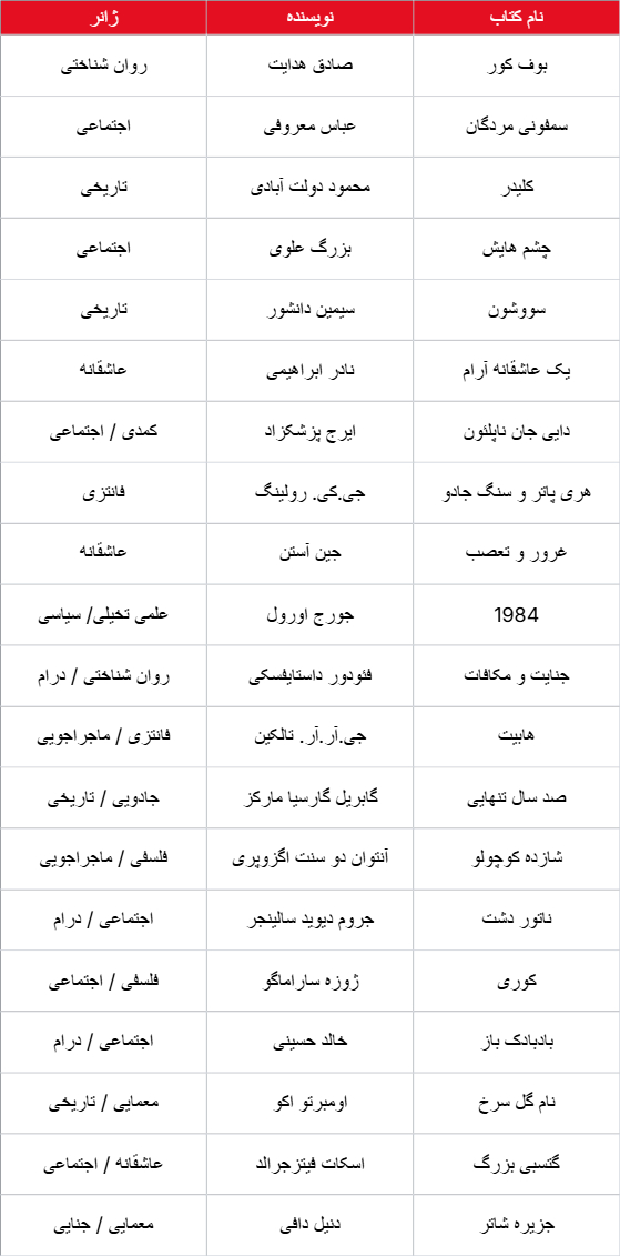 توجه داشته باشید که این فهرست شامل ترکیبی از رمان های ایرانی و خارجی است و تجربه ای جامع از ادبیات کلاسیک و مدرن ارائه می دهد.
